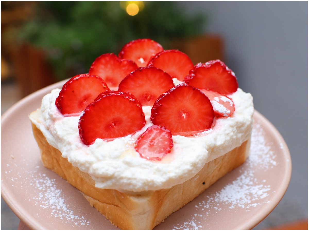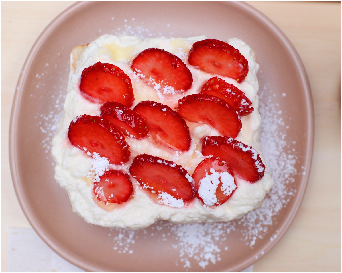 「ペリカン」の厚切り食パンの上にたっぷりの生クリームといちご。しっかりした食パンにふわふわの生クリーム&いちごの組み合わせは間違いないおいしさです。