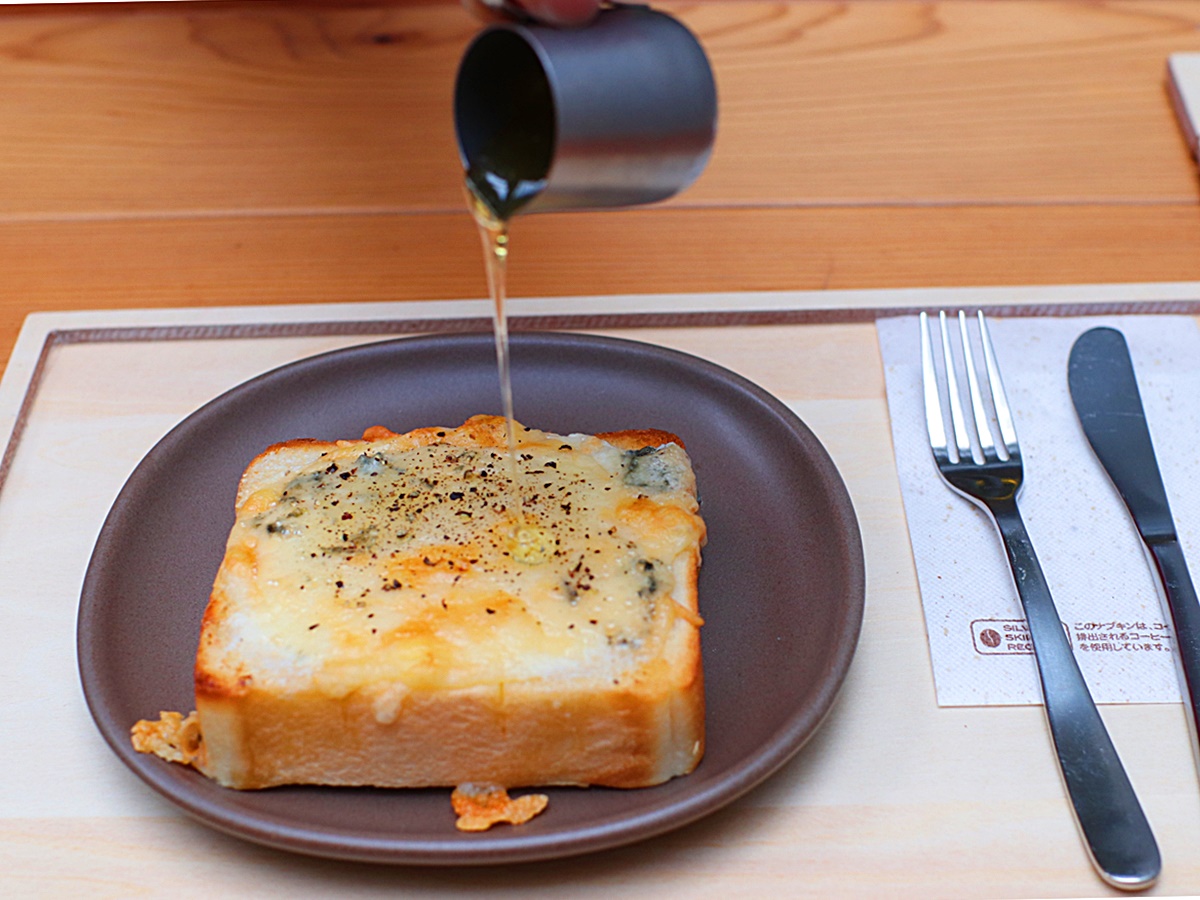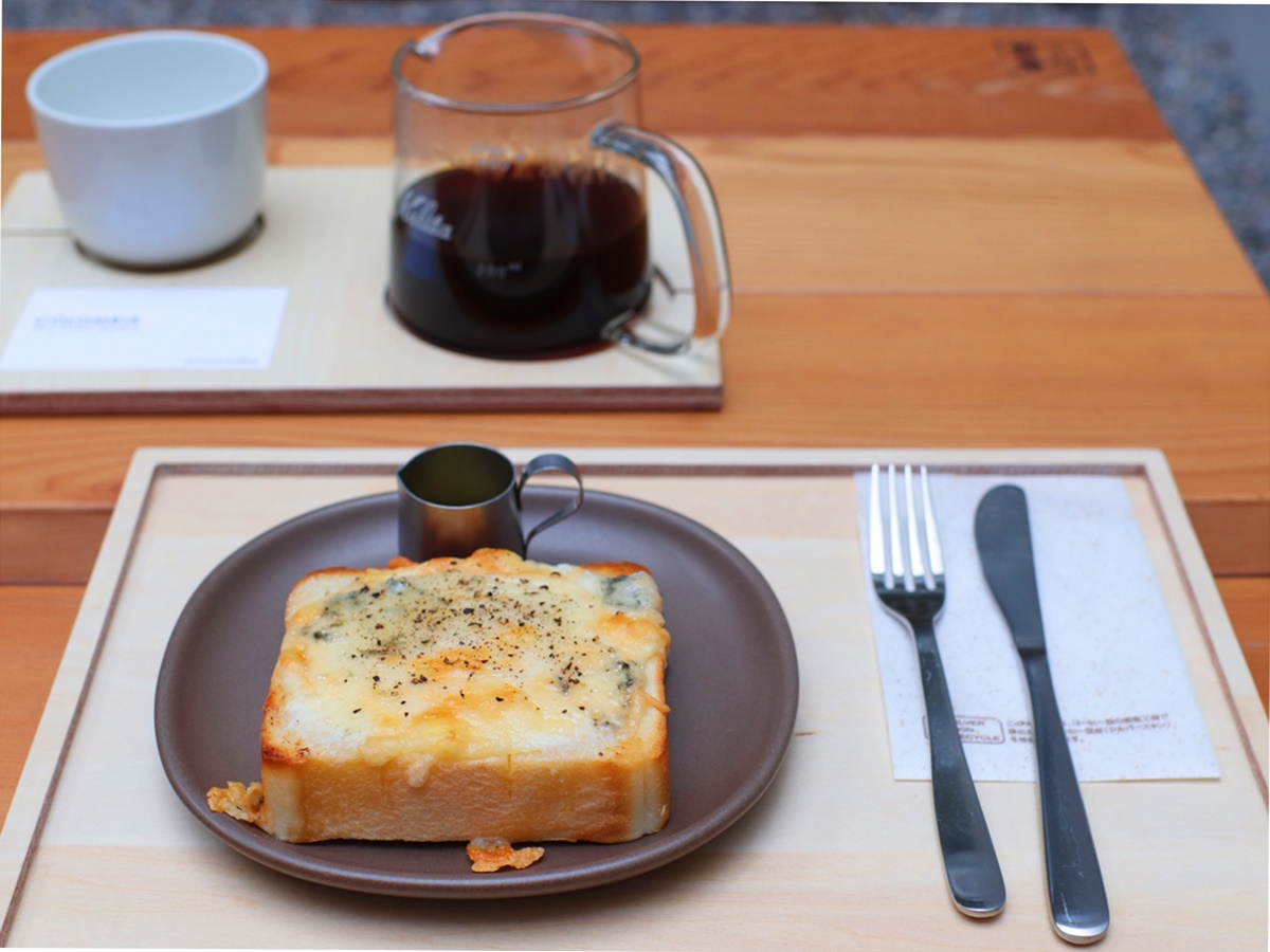 このコーヒーとともにいただくのは人気のチーズ・トースト。厚切り食パンにブルーチーズがおいしそうです。