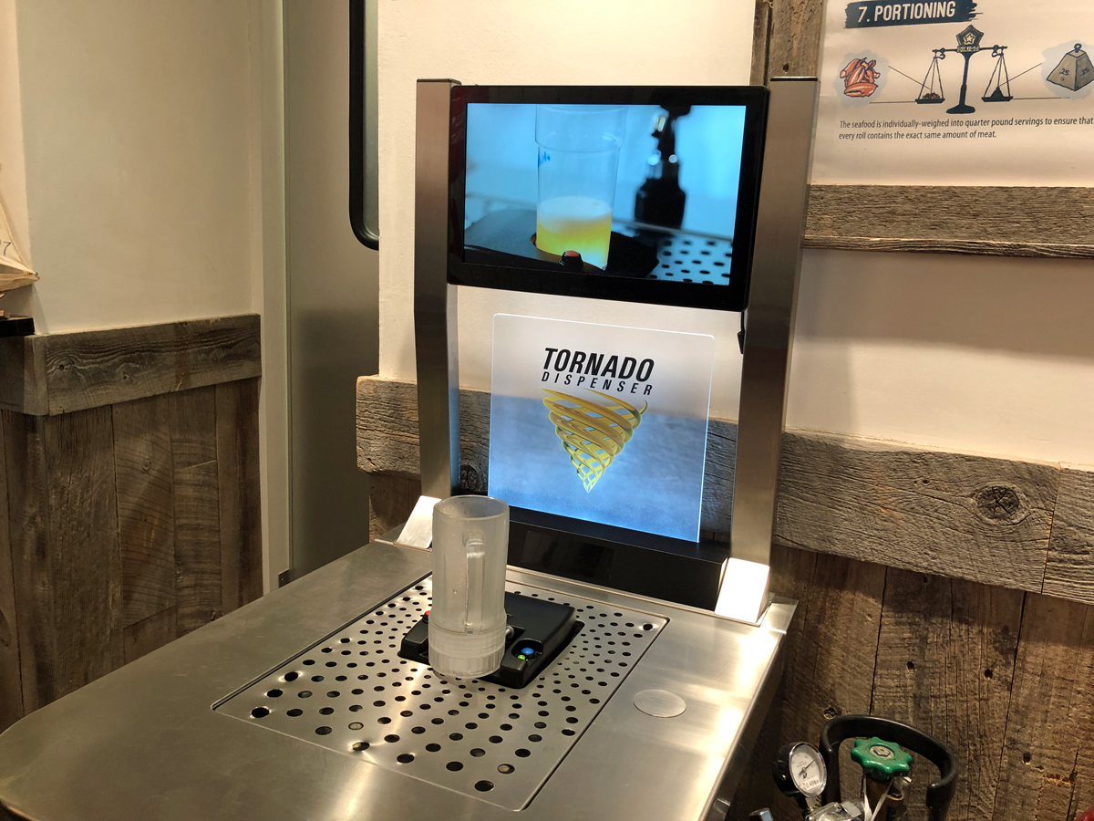 店内を見渡すと、気になる装置が!実はこれビールサーバーで、専用ジョッキの底に装置の挿入口をセットすると、下からトルネードのようにビールが注がれるそうです。
