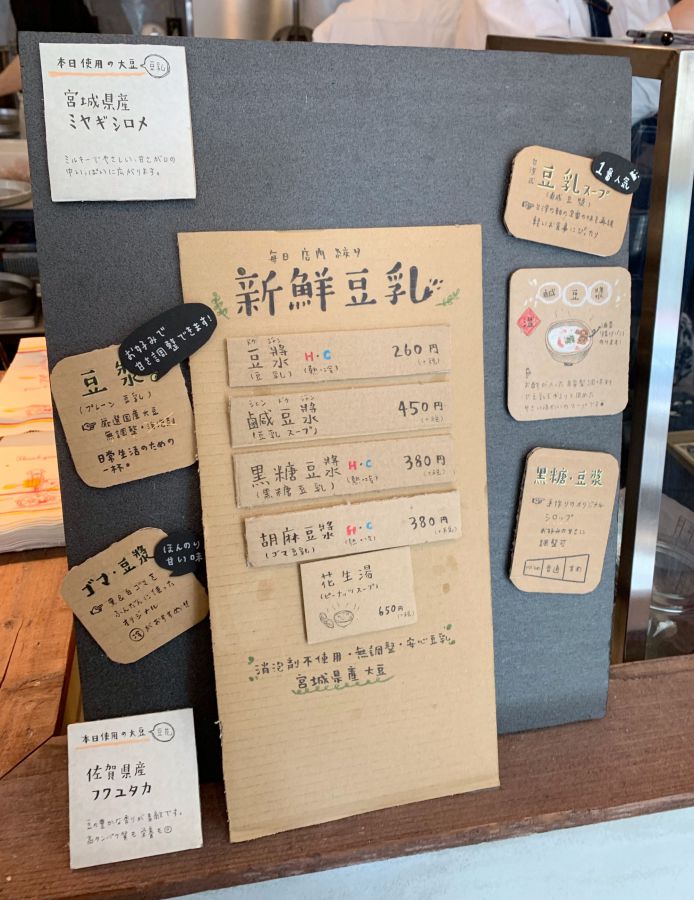 そしてこちらは、豆漿のメニュー。(2019年4月時点のもの)