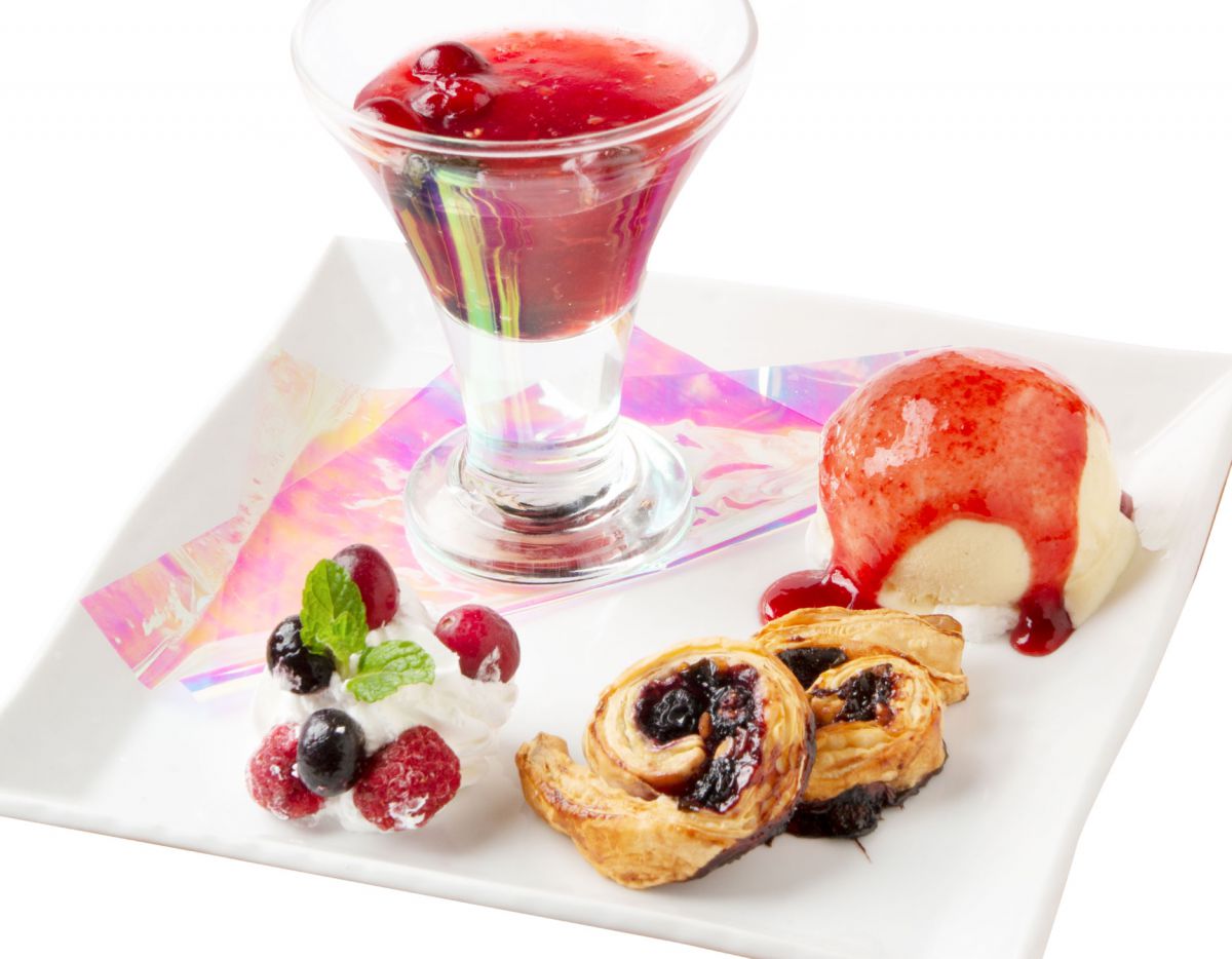 3種のベリーを使ったフィンランド伝統のトロンとしたゼリー風の温かいスイーツ「utatane風キーッセリ」780円は、シナモンロールパイとバニラアイスがのった春っぽさがかわいい一皿です。