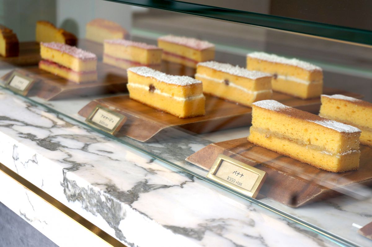 ショーケースには四角いケーキが美しく整列!ラインナップは定番とシーズナルを合わせて常時5種類ほど。 真ん中に自家製のジャムをサンドしたオリジナルのジャムサンドケーキは、全て米粉100%で作られています。