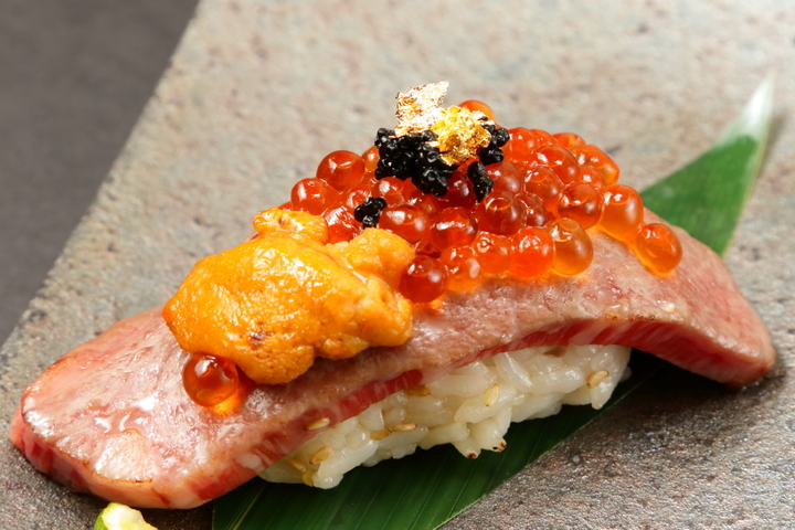 ディナータイム限定で提供される、キャンペーンの1つ目がコチラ!通常では提供していない『プレミアム炙り肉寿司』1人1貫無料サービス!! 表面を軽く炙った黒毛和牛・A5ランクの肉にいくらと雲丹、さらにはキャビアと金箔をのせた贅沢な一品です。
