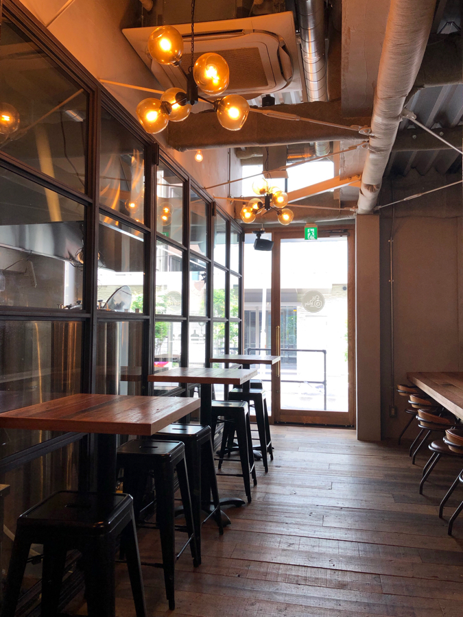 奥側にはひとりでもゆっくり過ごせるカウンター席や、ちょい飲みに利用したいハイチェアー席もあります。隣にはビールのブルワリーがあり、ガラス張りでなかが見えるようになっているんです。