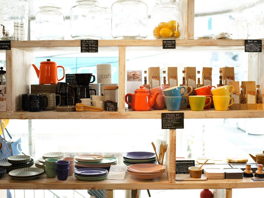 カフェに併設された雑貨スペースでは、食器やバッグなど毎日使えるおしゃれなアイテムから、あまり見かけない珍しいデザインのものまで、さまざまなアイテムが並んでいます。