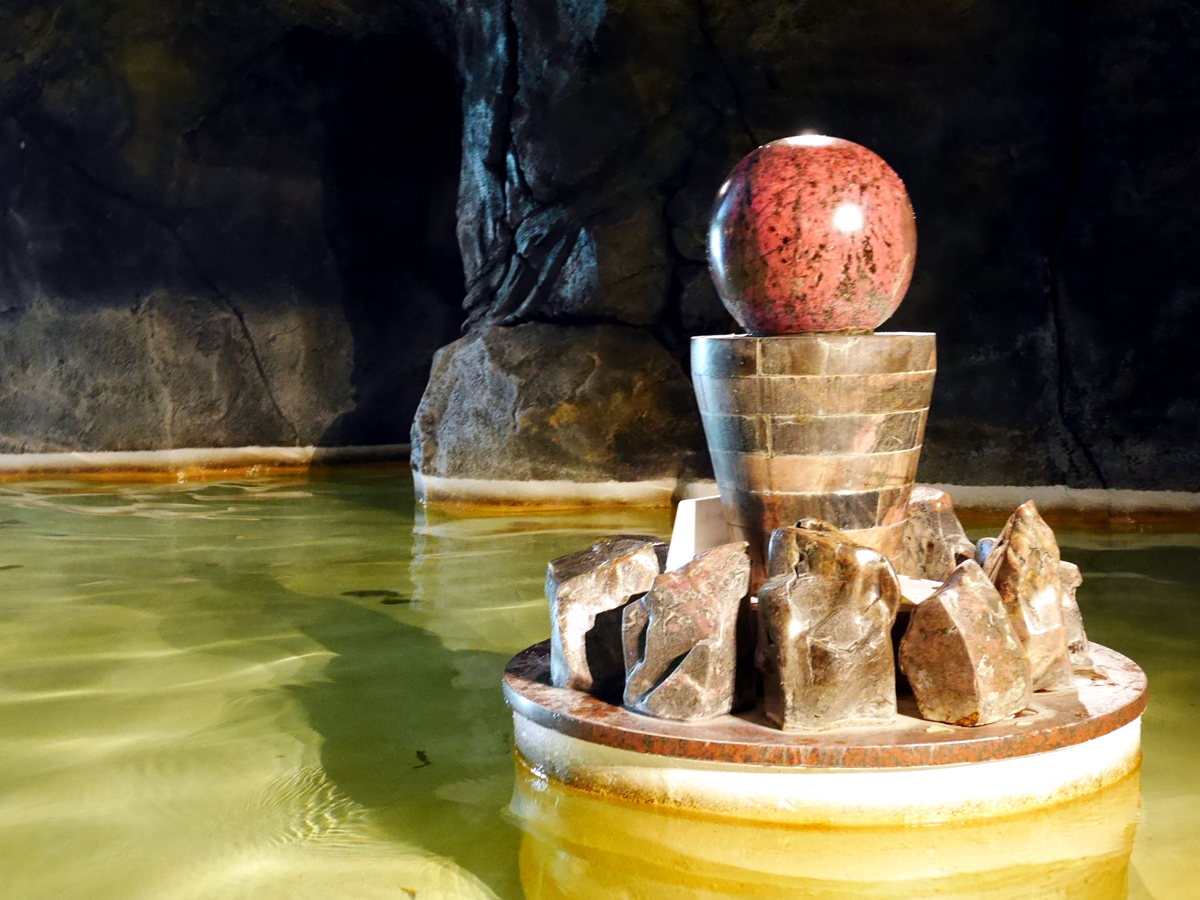 「洞窟風呂」のなかには幸福、愛、絆の意味を持つパワーストーン、マリンローズが!さまざまな縁を繋ぐパワーストーンに、カップルは永遠の愛を、シングルの人は素敵な出会いをお願いしちゃいましょう。