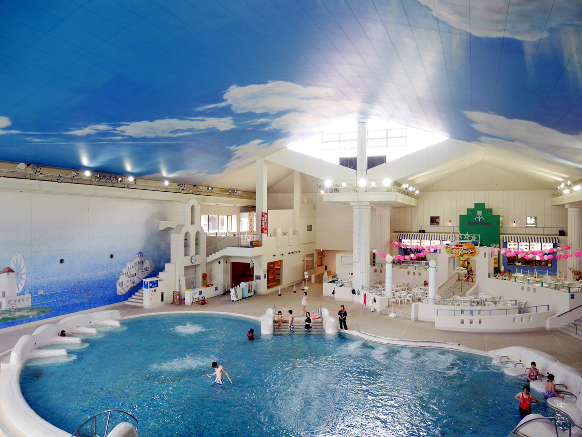 神奈川県箱根町にある「箱根小涌園ユネッサン」。全天候型の屋内施設と水着で利用する屋外施設、雨の日でも楽しめるスポットです。