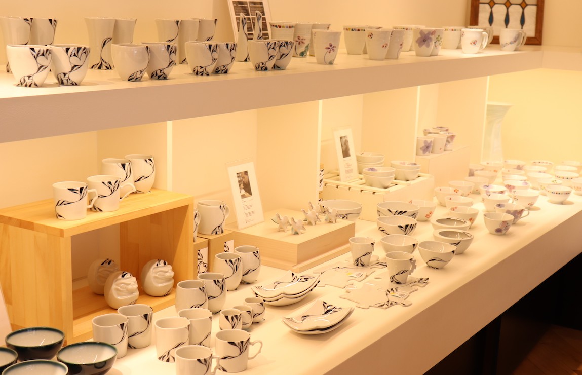 愛媛の伝統工芸品である砥部焼のコーナーも充実しています。白磁に藍色の伝統的な器のほか、若手の窯元が作ったカラフルな作品も並んでいます。