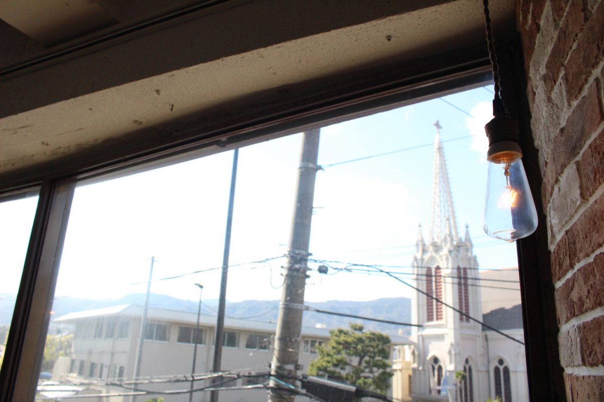 窓からは教会と山々の緑。明るい雰囲気のお洒落なカフェ