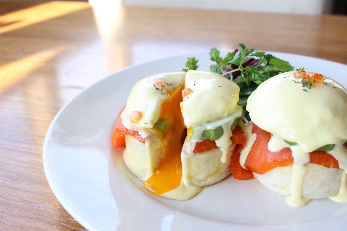 もう一つの人気メニューがエッグベネディクト。海外では朝食やランチの定番メニューです。もっちりしたマフィン生地の上に、具材とポーチドエッグがのり、オランデーズソースがかかっています。