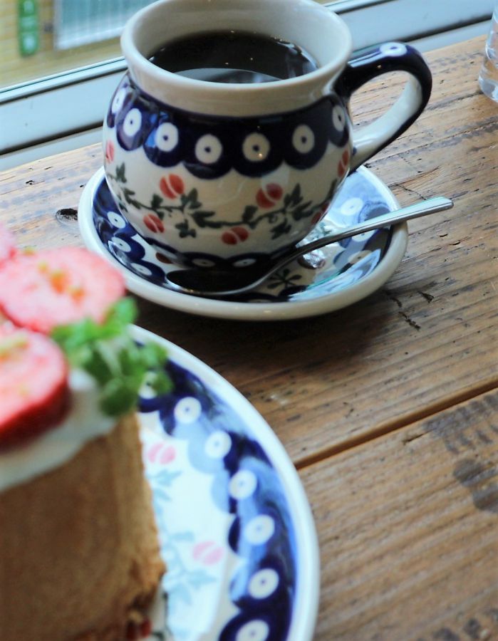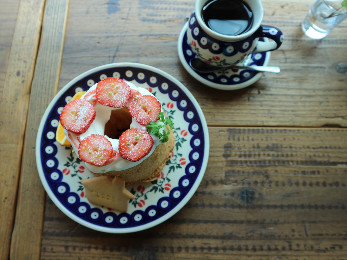 ワンホールといっても、直径10㎝で思わず「可愛い~!」と声が出てしまうサイズ感。店主お気に入りのポーランド食器、ポーリッシュポタリーとの相性もばっちり!