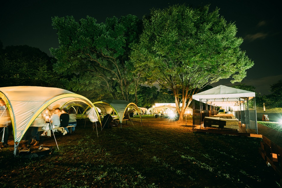 ガスランタンの眩い光がタープを照らし出し、ぐっとムーディになるナイトタイムの利用もオススメです。スピーカーの貸し出しも無料ですよ。