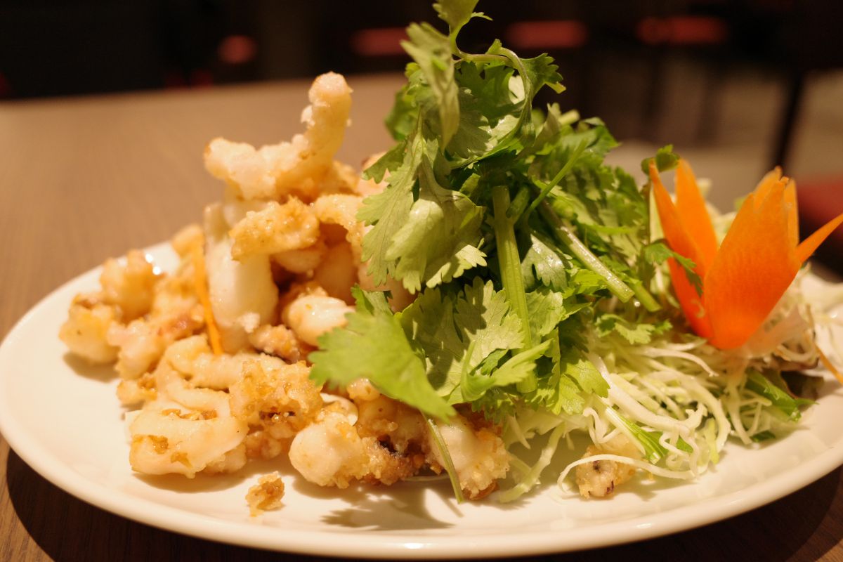 2皿目は「パームートードパクチー」。イカの天ぷらにたっぷりのパクチーを和えた一品です。