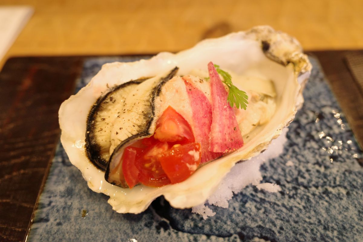 「牡蠣の湯引きのトマトソース」(税抜780円)は、クリーミーな牡蠣に酸味と甘みのあるトマトソースをあえた一品。見た目も鮮やかです。