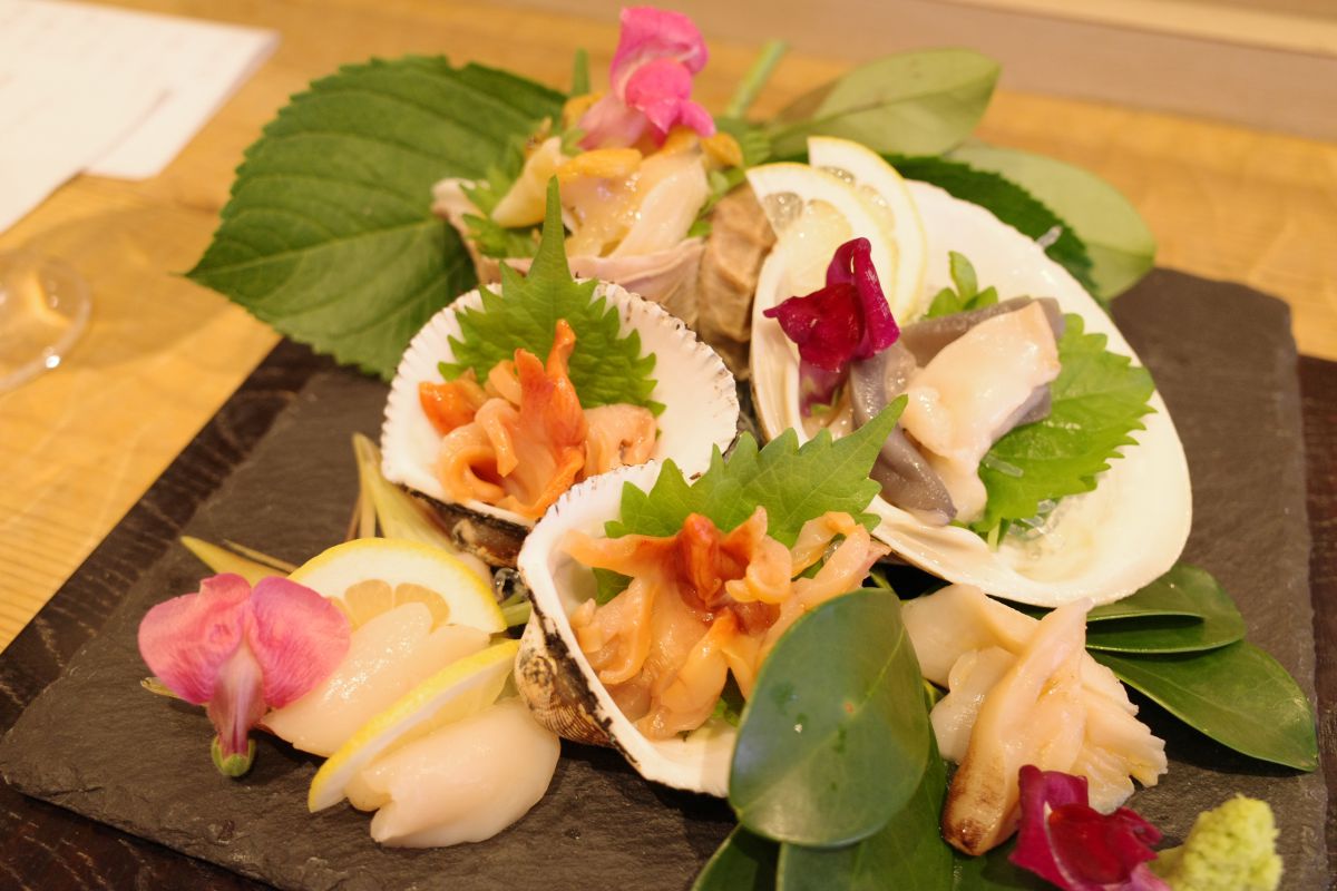 こちらは、つぶ貝、赤貝、帆立、ホッキ貝、白ミル貝が入った「貝刺し5種盛り合わせ」(税抜3500円)。赤貝やつぶ貝のコリコリッとした食感や帆立の滑らかな舌触りなど、貝それぞれの特徴を楽しんでください。