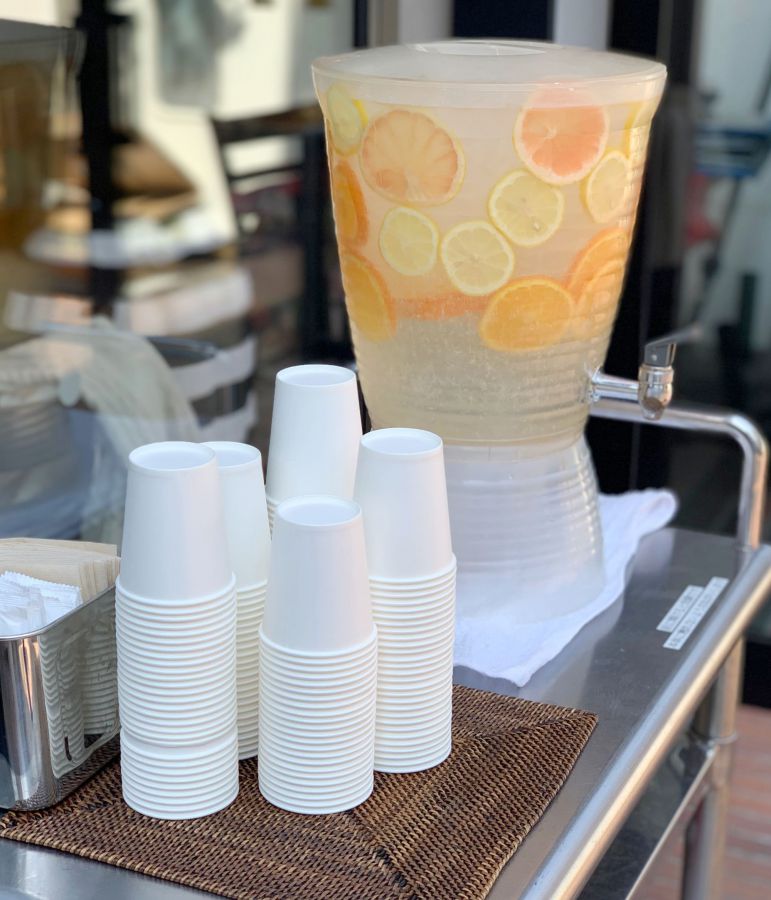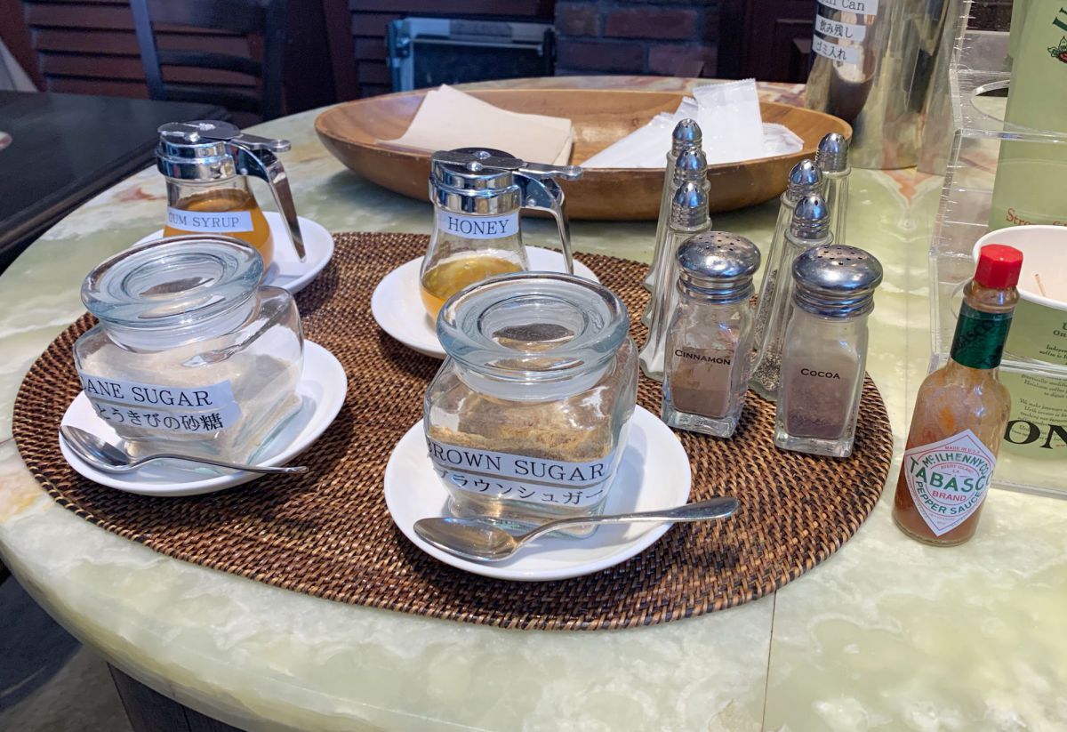 ひと手間加わっているフルーツ入りのウォーターや、きび砂糖、はちみつなどの体に優しい調味料が置かれていてうれしくなりますね!