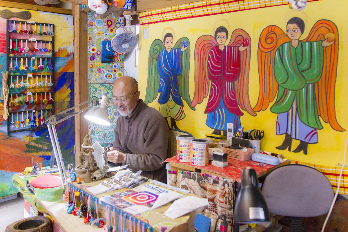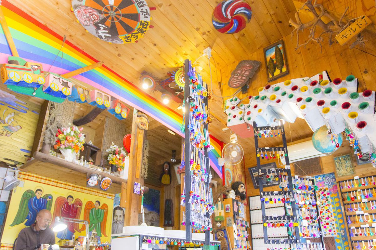 お香が焚かれた店内も手作り感いっぱい。天井にも壁にも絵画や彫刻、お面など、オブジェがたくさん飾られていて、異国の雑貨店に迷い込んだかのよう。これは全部、オーナーの知り合いのアーティスト達が手掛けたものだそう。