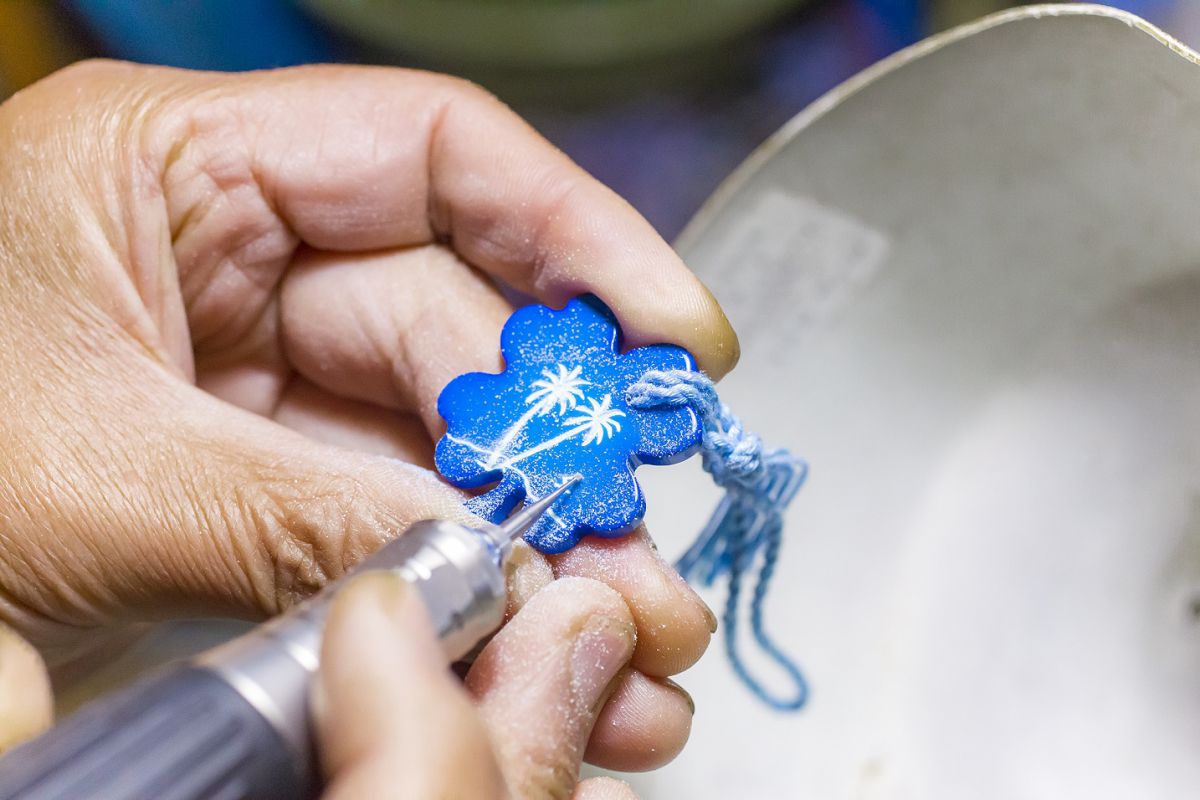 写真のようなヤシの木と海を繊細に描いたものでも、1~2分で完成!迷いなく彫っていく熟練の技に惚れ惚れします。