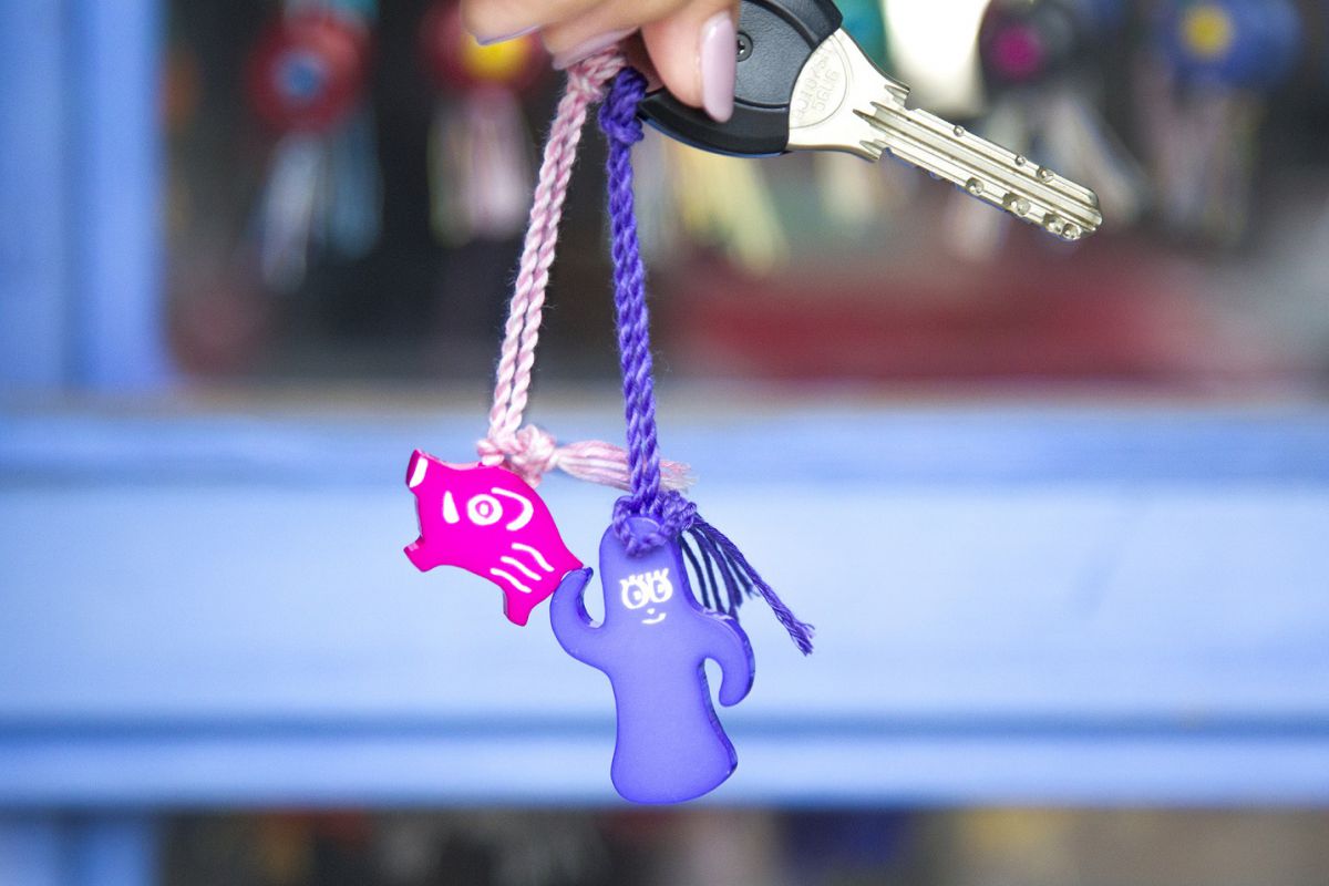 キーホルダーの材質は、牛乳に含まれるガゼインというたんぱく質成分を原料としたラクト。ボタンによく使われている材料で、現オーナー・北林輝雄さんのお父さんが彫刻ボタンの職人だったことがお店を開くきっかけだったのだそう。
