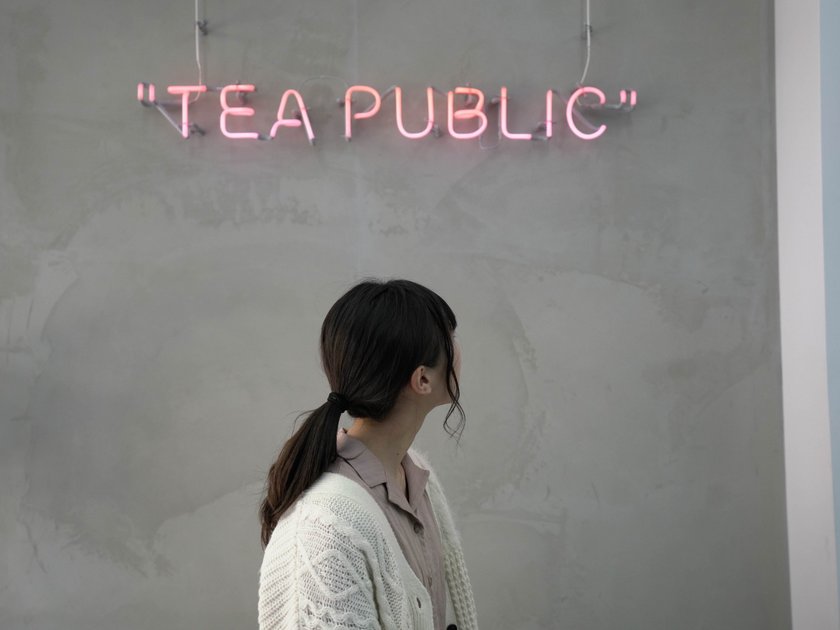「広島パルコ」から徒歩2分の場所にオープンした、黒糖タピオカ&タピオカティー専門店「TEA PUBLIC (ティーパブリック)」。壁にあるネオンの文字がおしゃれ。