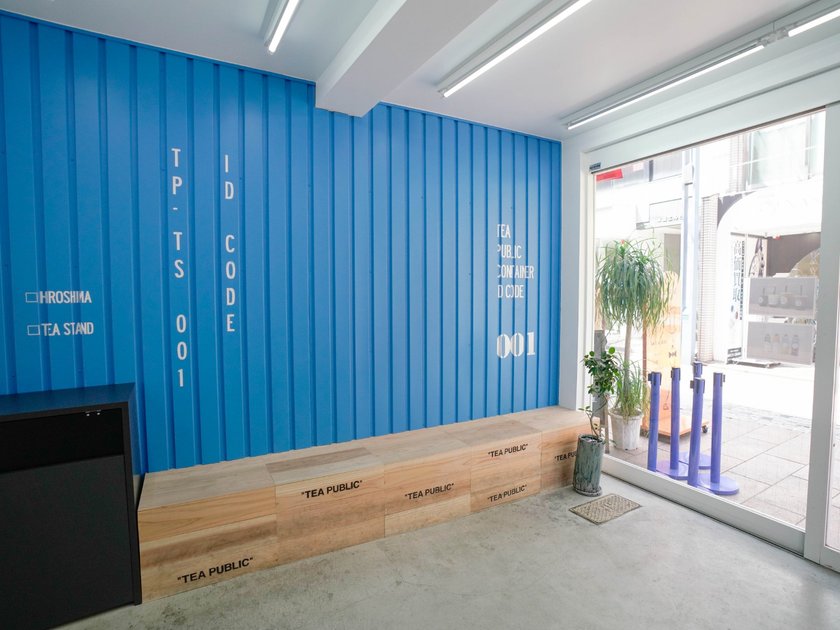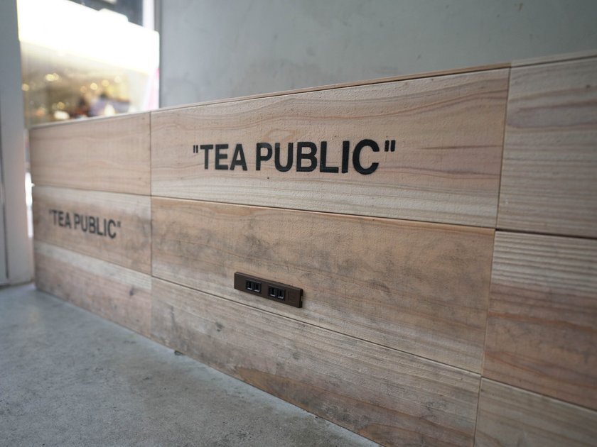 “TEA PUBLIC”の文字が書かれているおしゃれなベンチでゆっくりとタピオカドリンクを楽しむことができます。お子様連れの方もよく来られるそう。