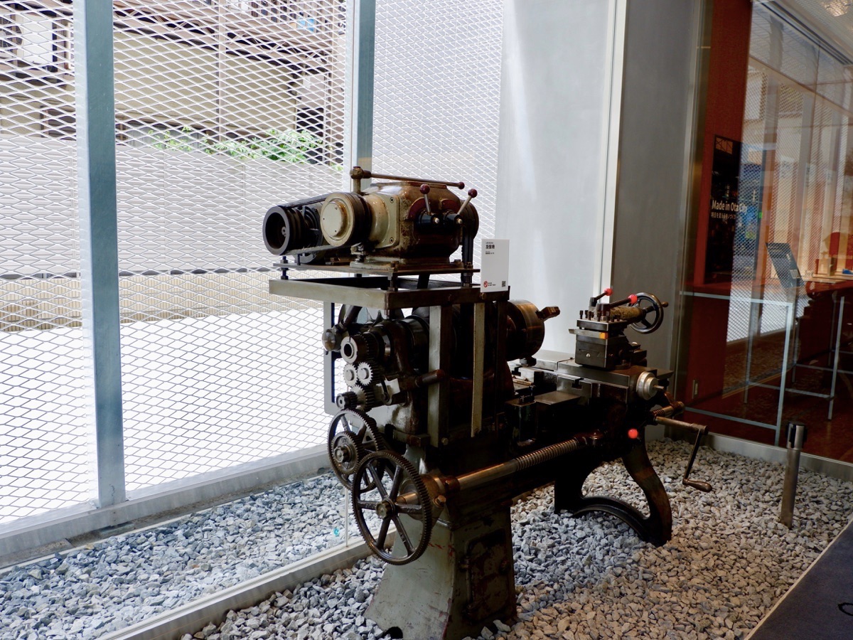 エントランスでは、かつて町工場で使用されていた旋盤機がお出迎え。