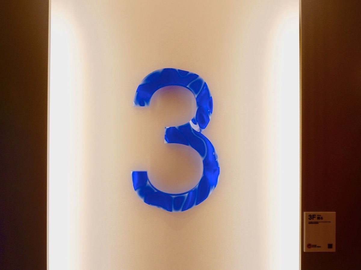 例えば、3階のテーマは「削る」。アクリル接着から、3次元切削、研磨まで一通りの工程を「日新電気株式会社」が手がけています。ブルーのアクリル樹脂が波打っているようで、思わず触ってみたくなります!