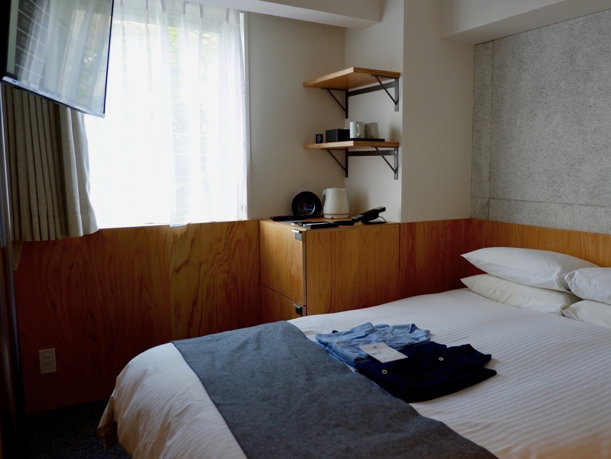 客室は全158室、5つのルームタイプがあります。写真は2名まで宿泊できる「オリエンタルダブル」です。ヘッドボードや内装仕上げには「針葉樹合板」が使われており、外から力を加えても耐える、高い強度を持っているのが特徴です。