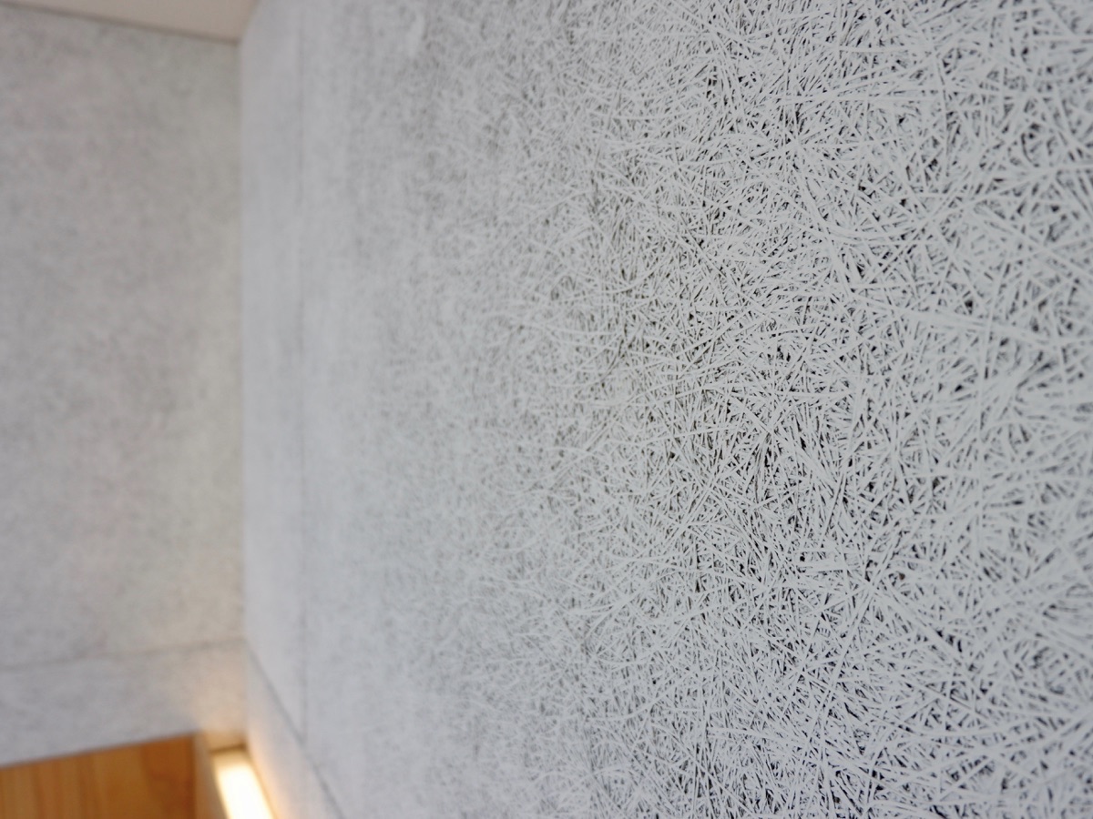 客室の壁は白い糸が編み上げられているような「木毛セメント板」を使用。木片などの木質原料とセメントを混合しており、板状に圧縮成形したものです。手で触ってみるとざらざらとした不思議な感触が伝わってきます。