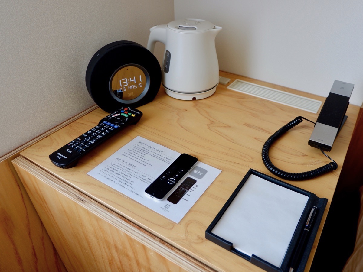 サイドテーブルには、apple TVのリモコンやアラームクロック搭載のBluetoothスピーカーが!