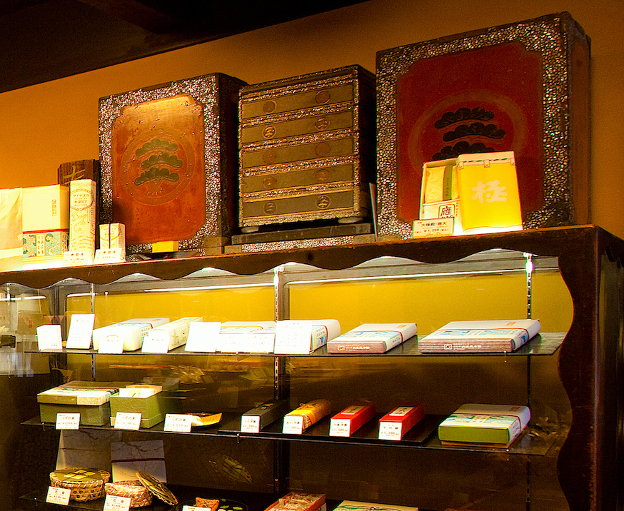 ショーケースの上にある年代物の菓子箱は、今でも現役で使われていて、年末、お得意様に御用聞きにいくための菓子が入っています。