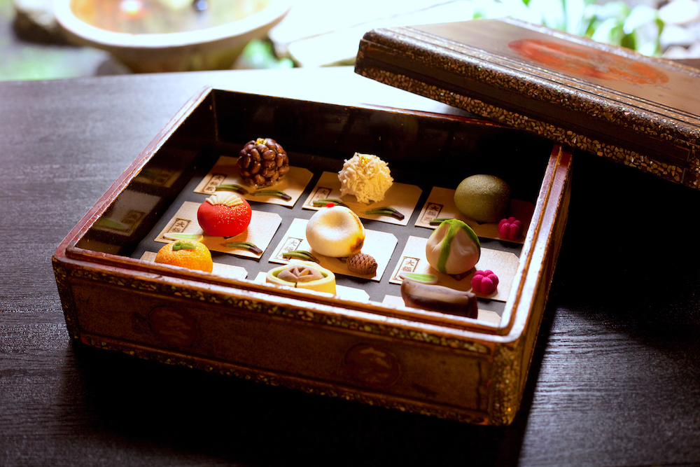 漆塗りに文様が描かれた菓子箱の蓋をあけると、美しい上生菓子が。「大極殿本舗」には年の瀬になると、新年を迎える菓子を用意するお得意様のために、菓子箱を持って回り、注文を受けるという習慣がまだ残っているそうです。
