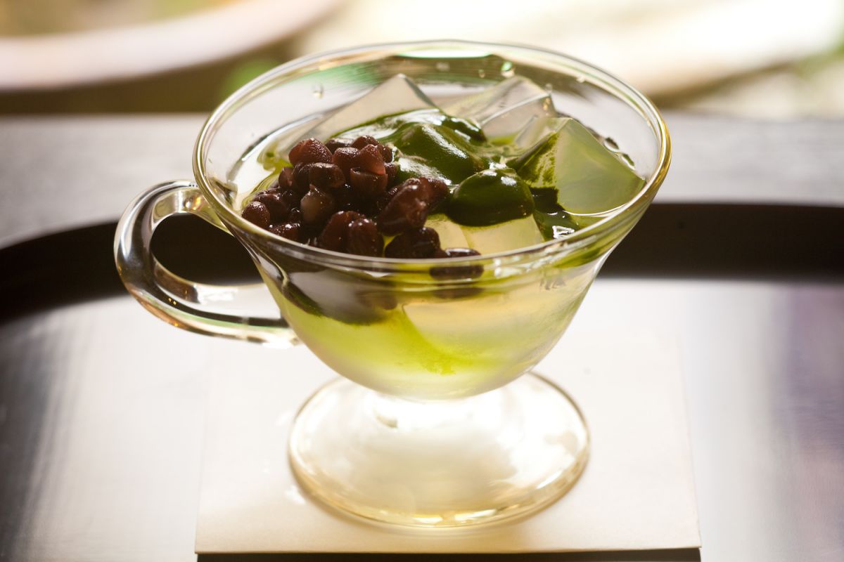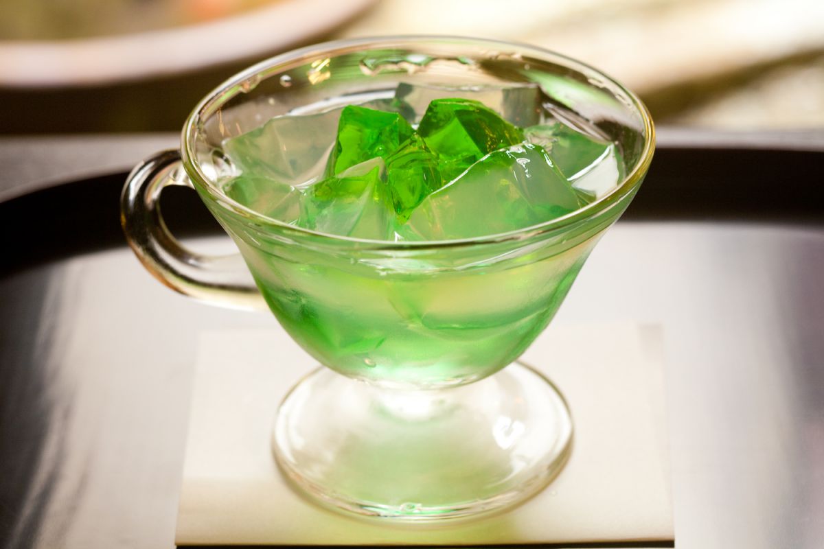京都の暑い夏に一服の清涼感を与えてくれるのが、7月のミント蜜。ミントのリキュールとペパーミントのゼリーの色も美しく、清々しい一品です。