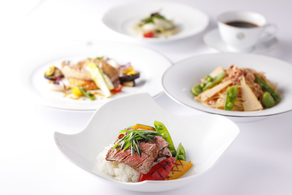 平日のランチタイム11~14時は、プリフィックススタイルのランチ2268円がおすすめ。メインディッシュを月替わりの季節の食材を使ったシェフおすすめメニュー2種か、牛フィレ肉のステーキ丼(+540円)の3種類の中から選べて、前菜とコーヒー・紅茶・ハーブティーがついたセットです。