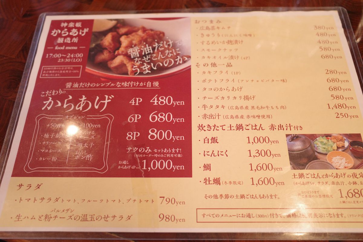 からあげは4つからオーダー可能なので、ちょっと飲みたいときにもうれしいですね。そのほかにも、広島の食材を使ったメニューが豊富に揃っていますよ。ちょっと1杯飲みたい!という人には、からあげとお通し、そしてお酒が1杯セットになった「サクのみセット」がおすすめ。