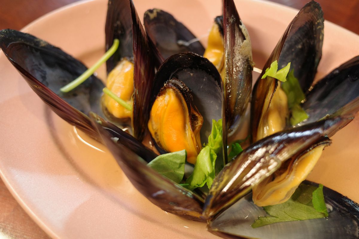 10月までの期間限定で楽しめるのは、宮島産の「ムール貝を使った酒蒸し」(ハーフサイズ580円、二人前980円)。季節的にまだ小ぶりですが、味は濃厚でスープまで飲み干してしまいたいほど…!お酒にもぴったりのアテです。