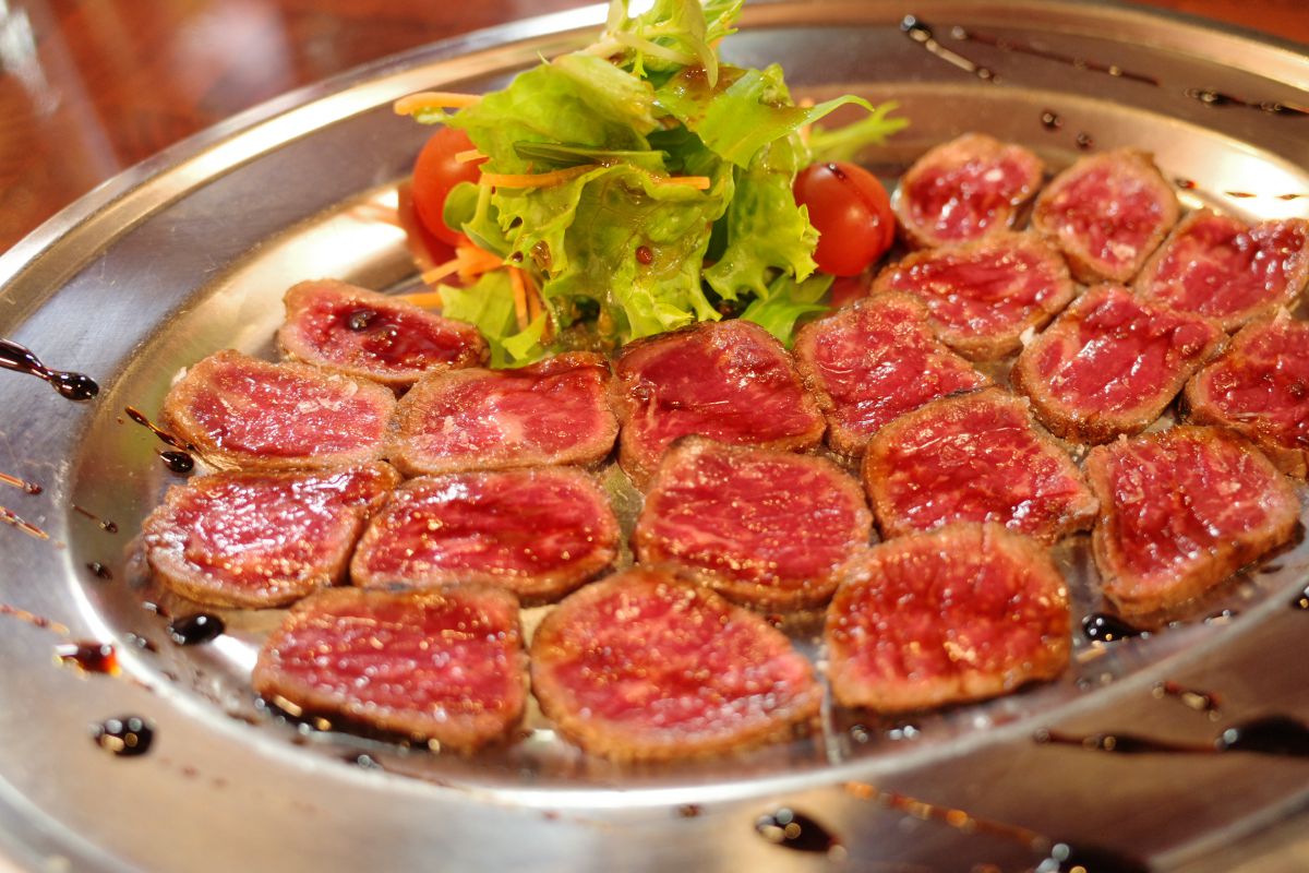 広島産黒毛和牛を使ったモモ肉のタタキ(税別1480円)も必食。ちょうどよい火入れで仕上げられた柔らかい黒毛和牛は、しょうゆを使ったソースとの相性も抜群です。