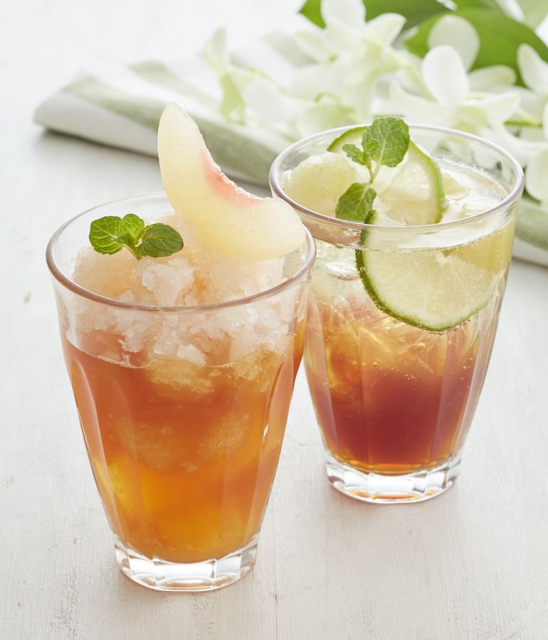 エルダーフラワー風味のフルーツルイボスティーに、白桃のシャーベットをたっぷりのせた「ピーチ&ルイボスのシャーベットティー(左)」886円は2019年6月26日(水)までの販売。季節のアイスティー人気NO.1のシャルドネダージリンを使ったアレンジティー「シャルドネダージリンのティーソーダ(右)」864円は2019年8月28日(水)まで販売されます。どちらもさわやかな季節にぴったりのドリンクです。