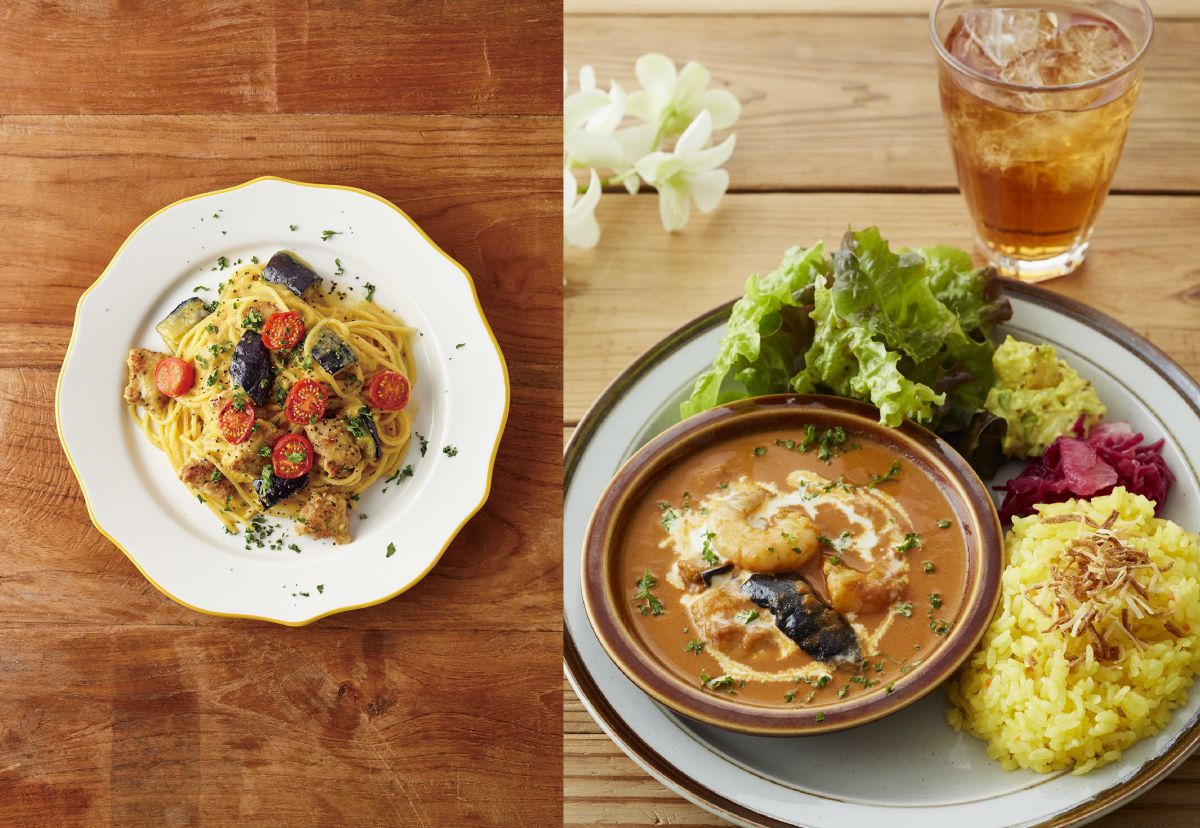 やさしい酸味の黄色いトマトクリームソースに、サルシッチャと揚げナスを合わせた「ナスとサルシッチャの黄色いトマトクリームパスタ(パン・紅茶付き)」1512円(左)と、海老、揚げナスをオリジナルスパイスミックスとアーモンドミルクで作ったクリーミーなトマトカレーの「海老とナスのトマトクリームカレー(紅茶付き)」1566円(右)は、2019年5月29日(水)までの販売なのでお早めに。