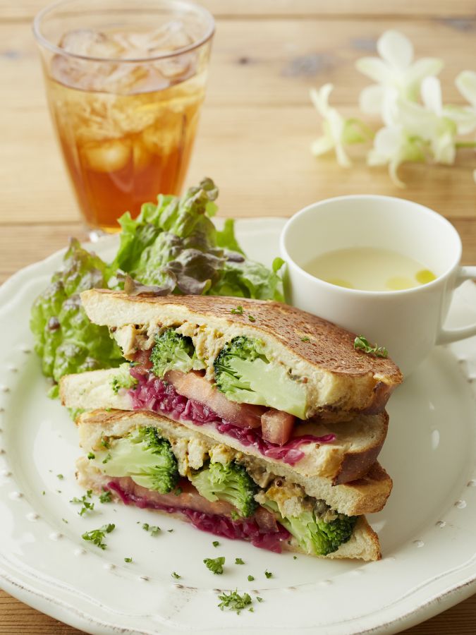 佐賀県産の“ふもと赤鶏”と飴色オニオンソテーを黒胡椒ソースでマリネして、いろどり野菜と粒マスタードソースでサンドした「蒸し鶏とオニオンソテーのフレンチトーストサンド」1491円は、2019年6月26日(水)までの販売メニュー。萌え断なサンドイッチもこの機会にぜひ。