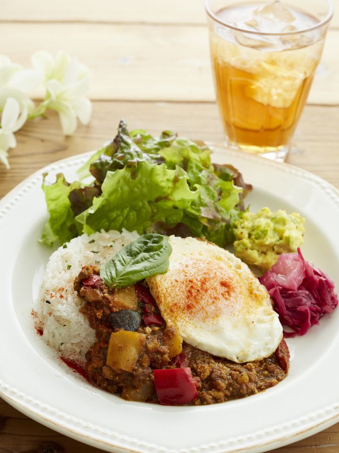 具沢山の野菜と鶏肉のバジル炒めに、トマトベースのキーマカレーを合わせた「ガパオ風キーマカレー(紅茶付き)」1512円は、2019年5月30日(木)~6月26日(水)の販売となります。半熟のタマゴを崩し、カレーと絡めて食べるのがおすすめですよ。
