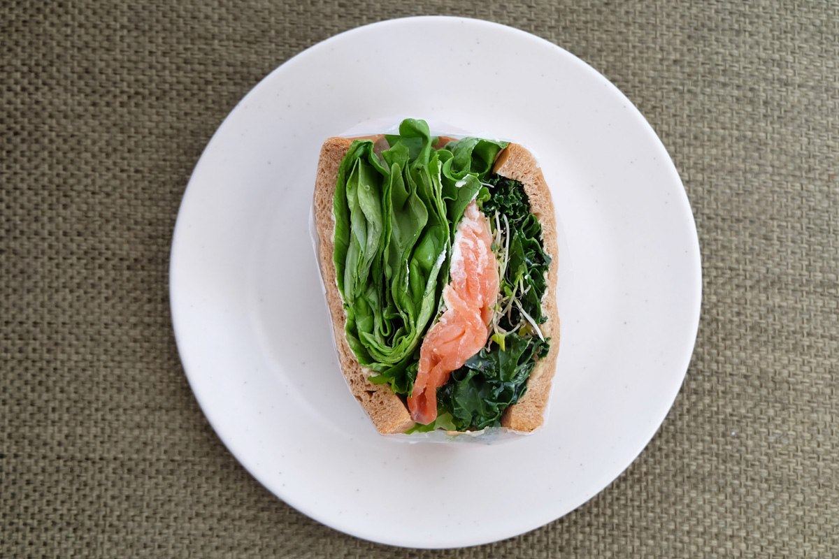 低糖質の食パンを使用した「スモークサーモンとリコッタチーズのサラダサンド」(480円)。たっぷりの野菜とスモークサーモン、チーズが相性抜群!亜麻仁ドレッシングを加えています。女性に大人気のメニューです。