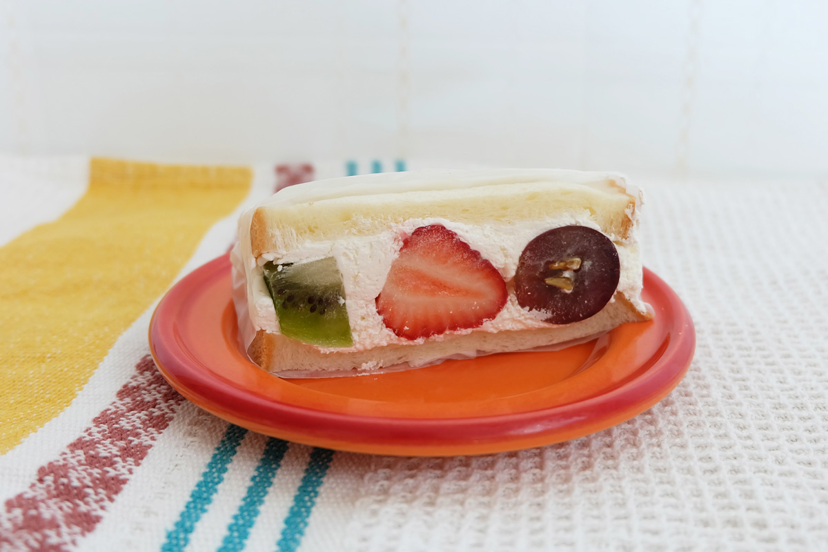 新鮮な旬のフルーツを使った「フルーツミックスサンド」(380円)。取材時は、いちご・キウイ・ブドウが入っていますが、季節によりフルーツの内容は変更になります。フルーツの旨味をぎゅっと閉じ込めたサンドです。