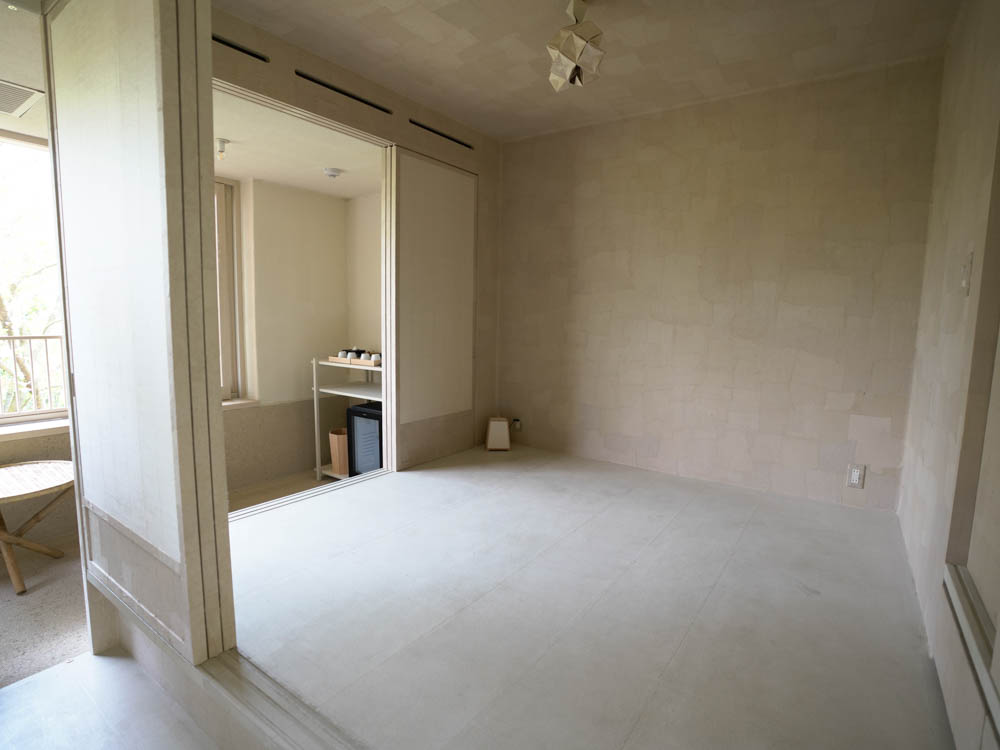 シングルサイズの布団が2組敷けるスペースが左右に2つ。床や壁、ふすままで、すべて手すき和紙が貼ってあるのが特徴です。これらも1枚1枚、手作業で貼ったのだとか。