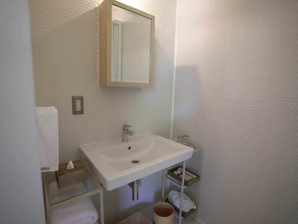 アメニティーも充実していて、快適に過ごすことができます。真っ白な洗面台やシャワールームは、いつもとは違う空間を一層演出してくれそう。