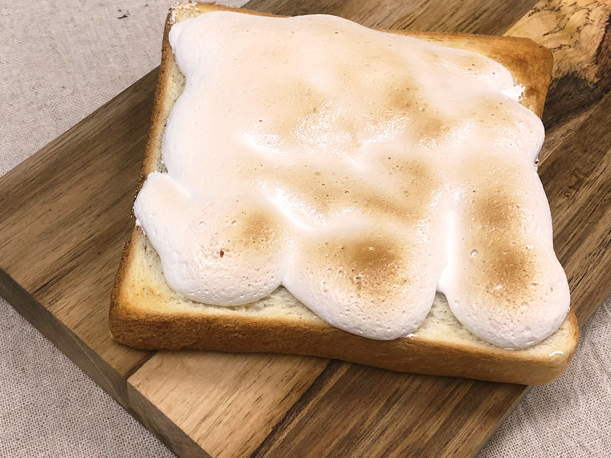 弾力のあるマシュマロクリームの食感を楽しむために、先に食パンを軽く焼いてからクリームをのせて、最後に数十秒軽く焼くのがおすすめです。