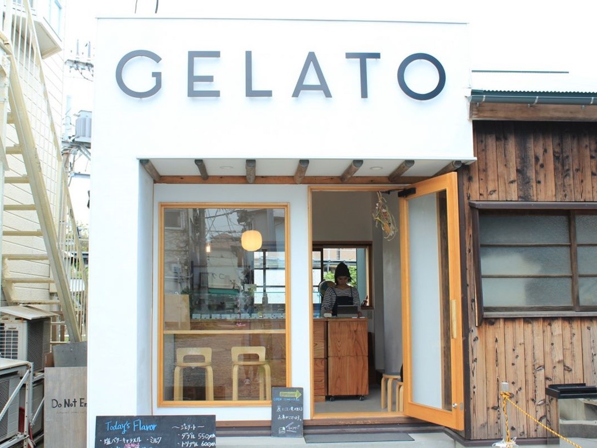 真っ白の壁にシンプルな「GELATO」の文字がかわいい外観。こちらの建物はもともと商店街の事務所に使われていたという、古い建物をリノベしたもの。