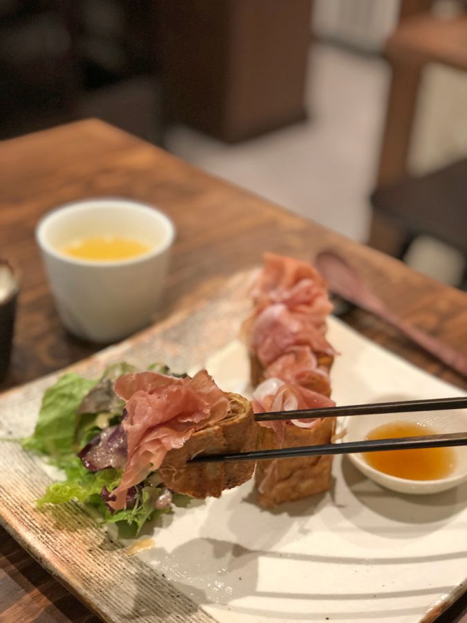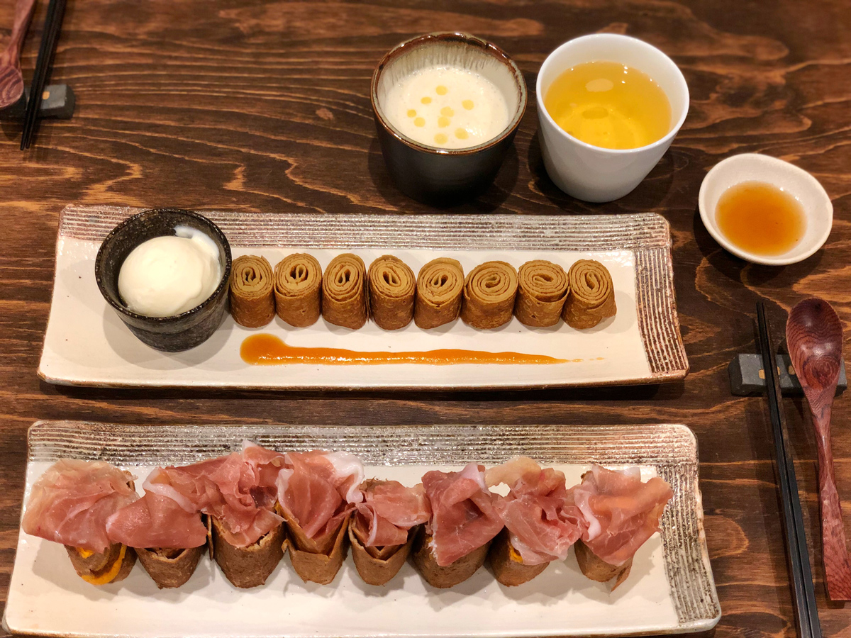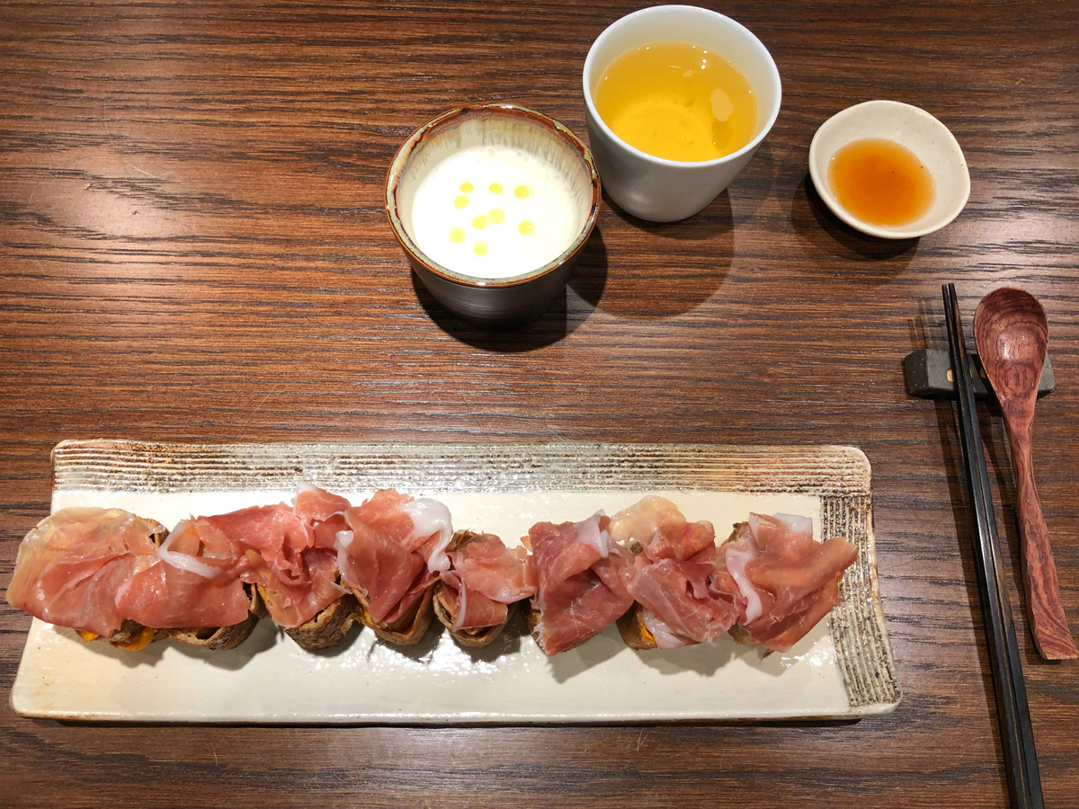 カリッと香ばしく焼かれた生地には、たまごとコクのあるチーズが巻かれていました。そこにパルマ産の生ハムがのせられていて、それだけでも十分においしいのですが、これをとろみのある蕎麦出汁につけると、さらに濃厚な蕎麦の風味を楽しめました。
