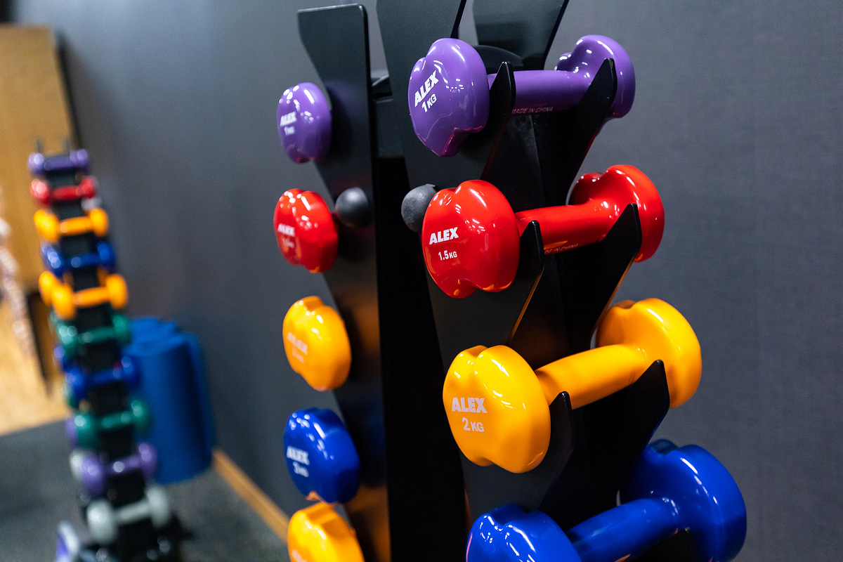 また大浴場の隣には、無料で利用できるジムもあります。ランニングマシーンやバイクなど、誰でも気軽にトライできそうなものばかり。こんなにカラフルでかわいいダンベルもありますよ。