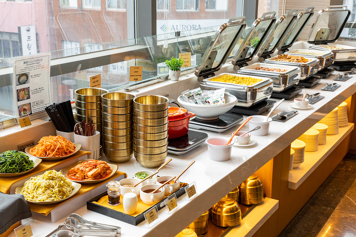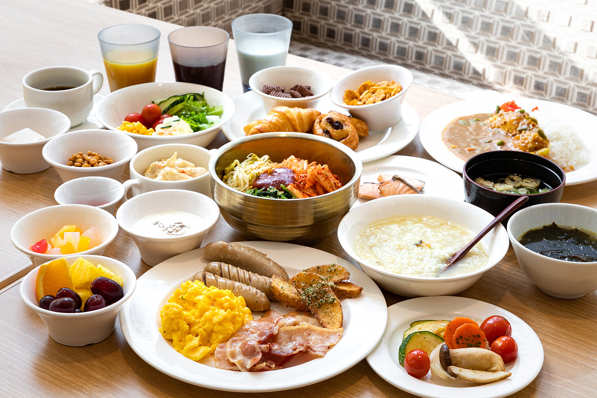 和洋韓の料理&デザートが揃うビュッフェ。あわび粥、ビビンバ、わかめスープ、キムチ…。“韓国の味”はもちろんマスト!そのほかにも日本的なカレーや焼きたてのパン、フワフワのスクランブルエッグなど、日本でおなじみのメニューもズラリと並びます。